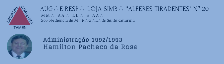 8 - Durante este período administrativo foi reformada a Galeria dos Ex-Veneráveis da Loja e aquisição de um novo Estandarte, além da confecção e distribuição de Manuais de Legislação Maçônica, contendo a Constituição, Regulamento Geral da M.: R.: Grande Loja de Santa Catarina e Regimento Interno da Loja Alferes Tiradentes.