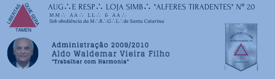 39) Em 11/03/2010, Sessão conjunta com a ARLS.·. União e Verdade Nº 53 da Grande Loja de Santa Catarina. Na oportunidade tiveram presentes a Sessão 26 (vinte e seis) Irmãos da ARLS.·. Alferes Tiradentes Nº 20. O Ir.·. Geraldo Morgado Fagundes deu uma Palestra com o tema: "Uma Síntese Histórica da Maçonaria para Aprendizes".