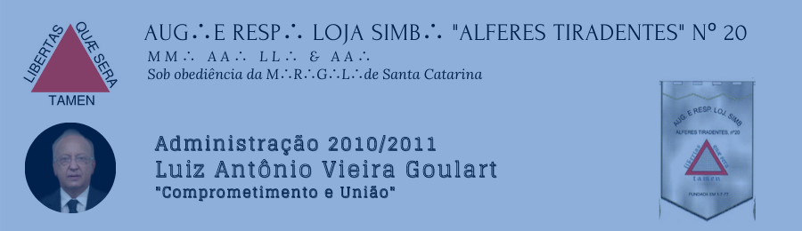 01) Em 18/06/2010, Sessão Magna de Instalação do Irmão Luiz Antonio Vieira Goulart tendo como Presidente da Comissão Instaladora da Grande Loja de Santa Catarina o Ser.·. Grão-Mestre, Irmão José Domingos Rodrigues. Foram instalados os Veneráveis Mestres de todas as Lojas que trabalham no Templo situado em Itacorubi: Universo III nº 77; Alferes Tiradentes nº 20; Duque de Caxias nº 21; Manoel Gomes nº 24; Universo nº 43 e Pedreiros da Liberdade nº 79. Da Comissão Instaladora, também, fizeram parte o Deputado do Grão-Mestre Ir.´. João Eduardo Noal Berbigier e o Grande Orador Ir.·. Sinval Santos da Silveira.